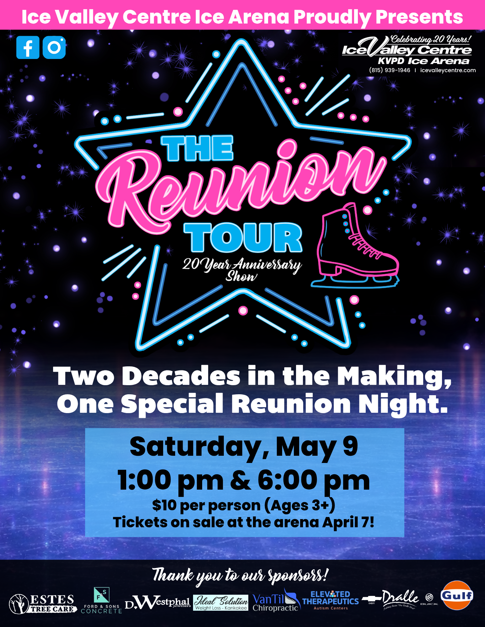 Ice Valley Centre Ice Arena proudly presents The Reunion Tour, our 20 Year Anniversary Show. This year’s spring ice show will light up the rink with the excitement of a milestone celebration, the emotion of a homecoming, and the unforgettable magic of two decades of ice show memories coming together in one spectacular event.