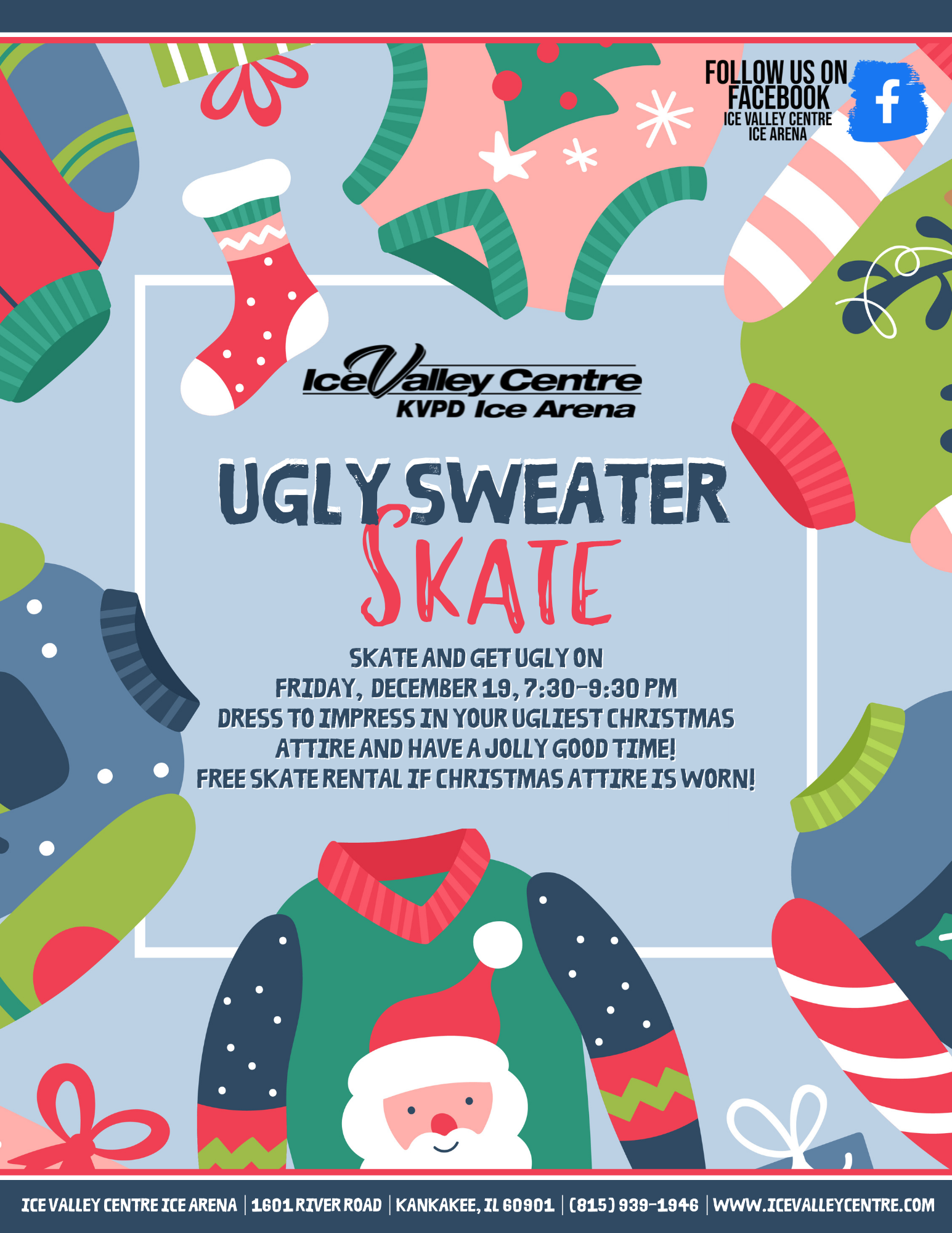 Skate and get ugly at Ice Valley Centre Ice Arena on Friday, December 19 from 7:30-9:30 pm during our annual Ugly Sweater Skate!