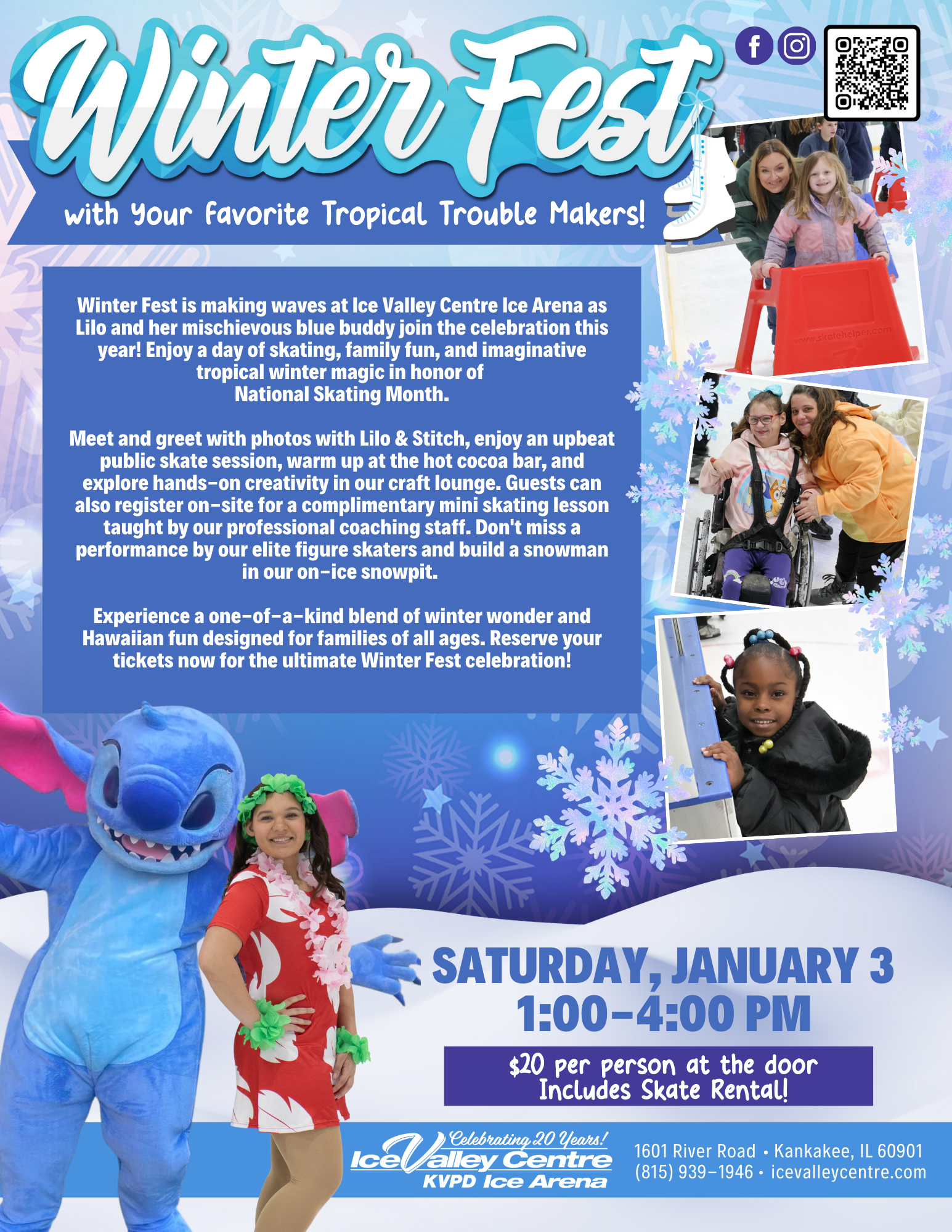 Join us at Ice Valley Centre Ice Arena on Saturday, January 3, for our annual Winter Fest, featuring two new special guests joining the fun! Celebrate National Skating Month with a day filled with skating, family activities, and a hint of tropical winter magic.